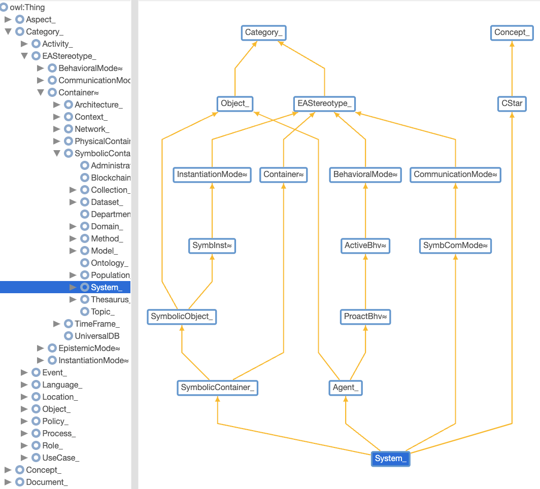 OWL 2 hierarchies (yellow lines) are used to organize entries on a conceptual basis while remaining neutral with regard to abstraction semantics. For example, systems are defined in terms of agent and artifacts without any assumption regarding inheritance.